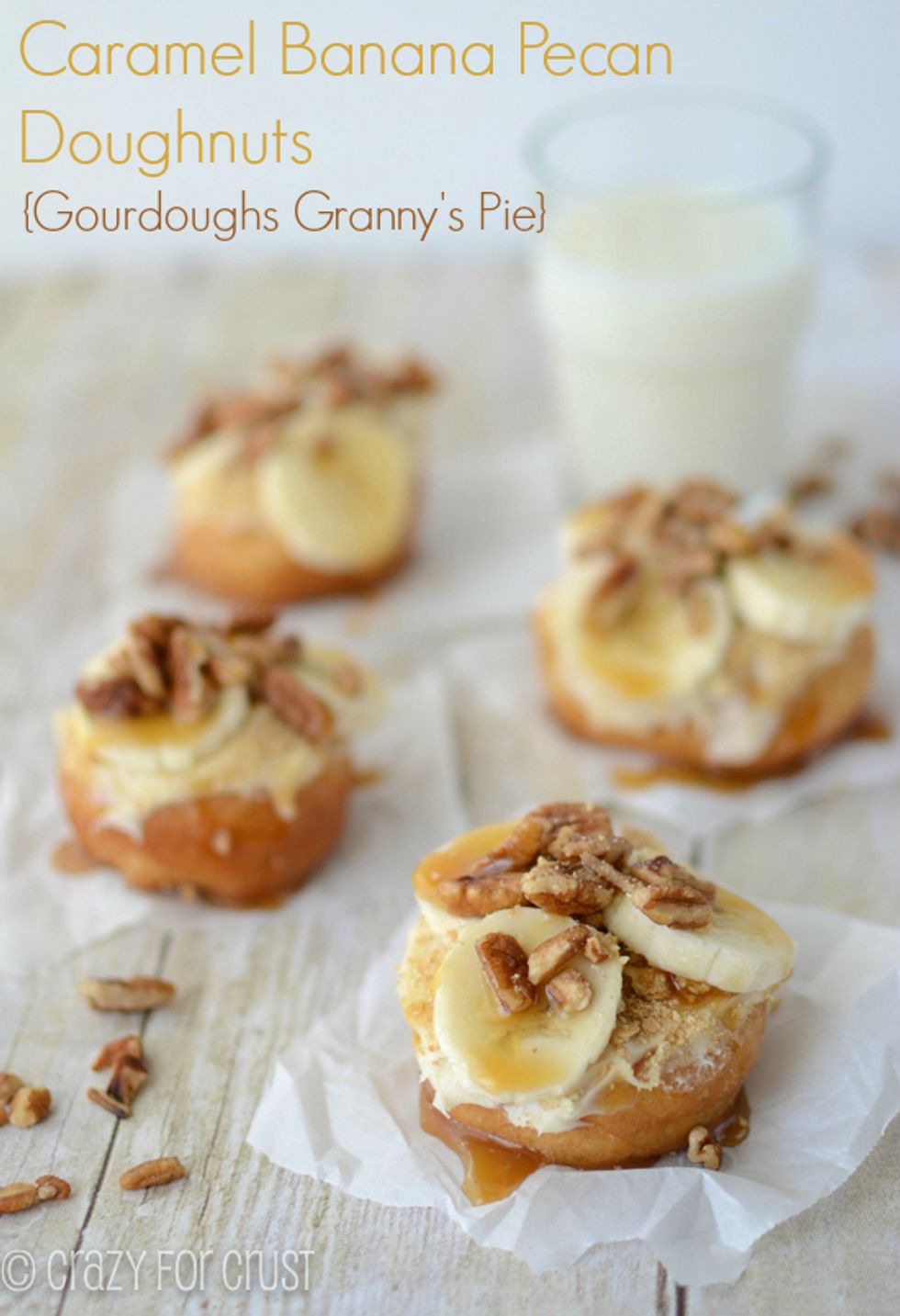 An easy fried doughnut topped with frosting, bananas, caramel, and pecans!