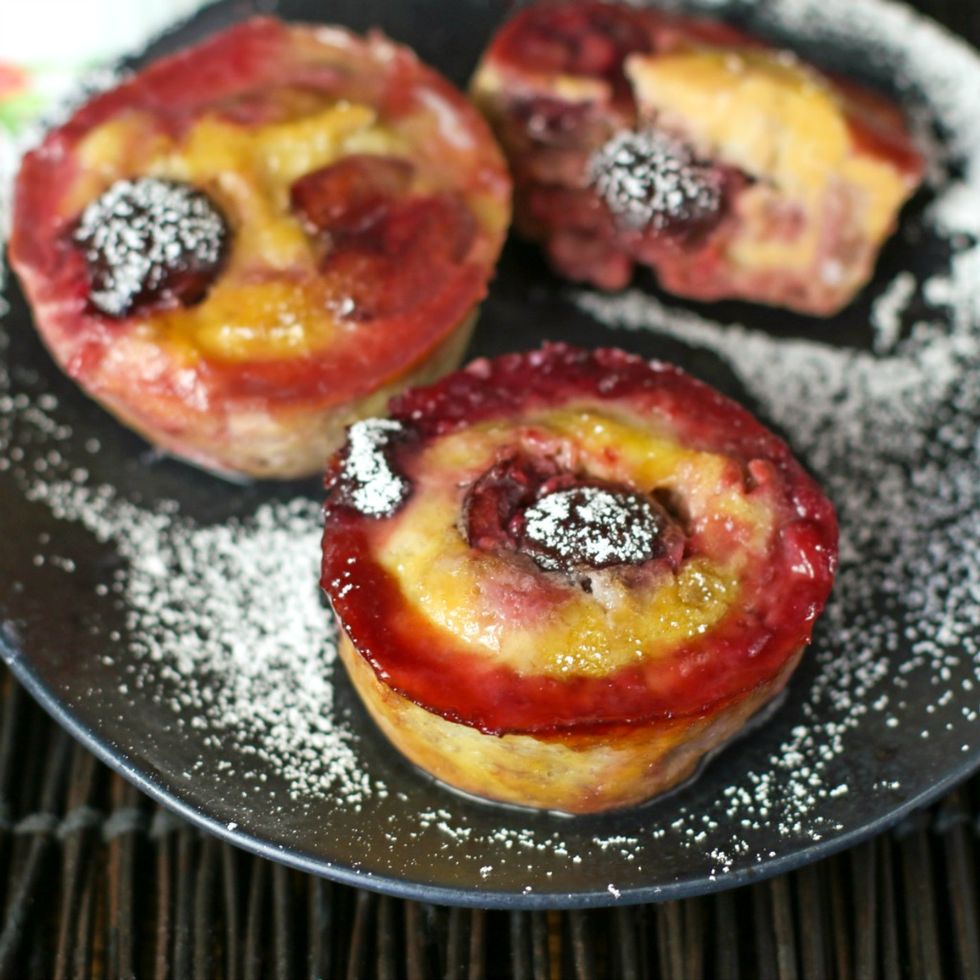 Banana Cherry Custard Muffins are the perfect quick breakfast or guilt-free healthy, 4 ingredient, sweet, lo-calorie snack!