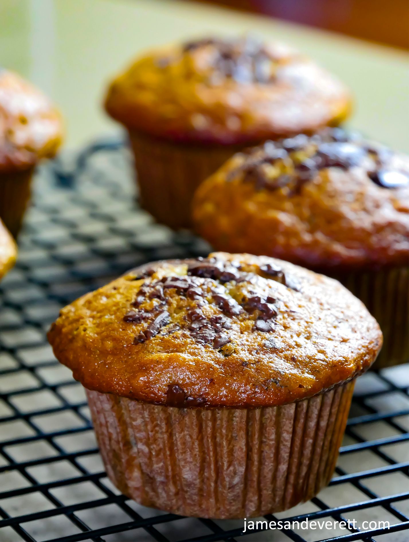 Chunks of dark chocolate and tart currents add a delicious contrast to the sweet flavor of banana in these easy to make muffins.