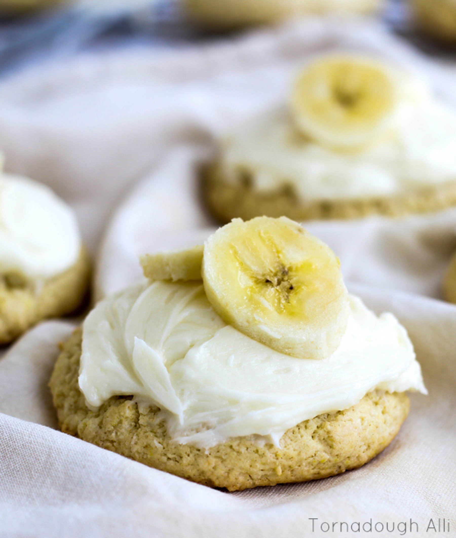 A huge pillowy banana flavored sugar cookie topped with creamy and fluffy cream cheese buttercream.