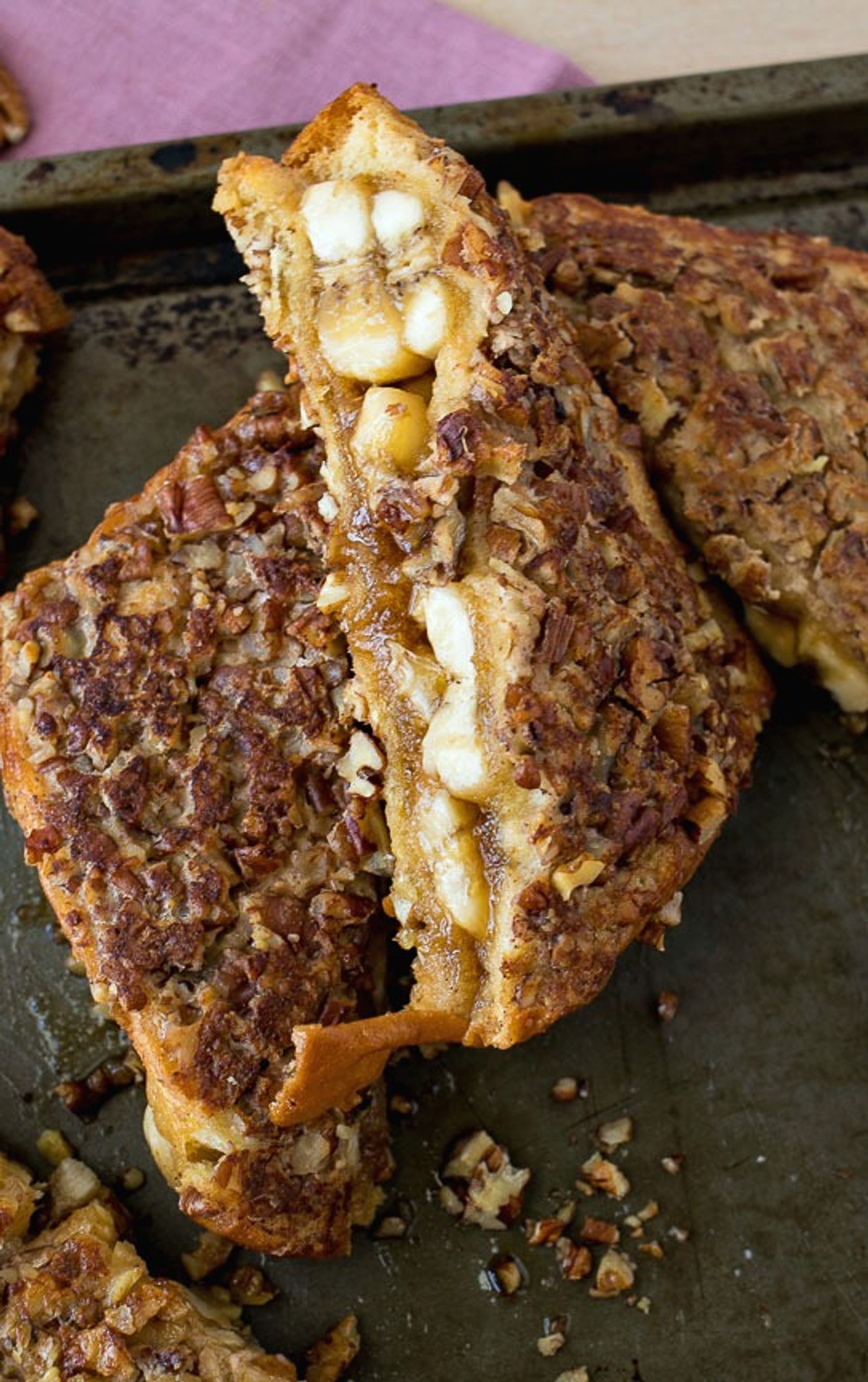 Banana Nut Stuffed French Toast – Sweet and sticky bananas stuffed into french toast and covered in chopped nuts. A fun, yet easy breakfast that the whole family will love!