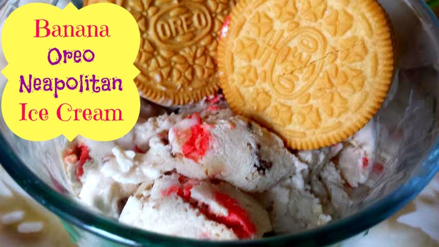 Homemade banana and Oreo Neapolitan Ice Cream made without an ice cream machine - a nice, cold, sweet treat for summer!