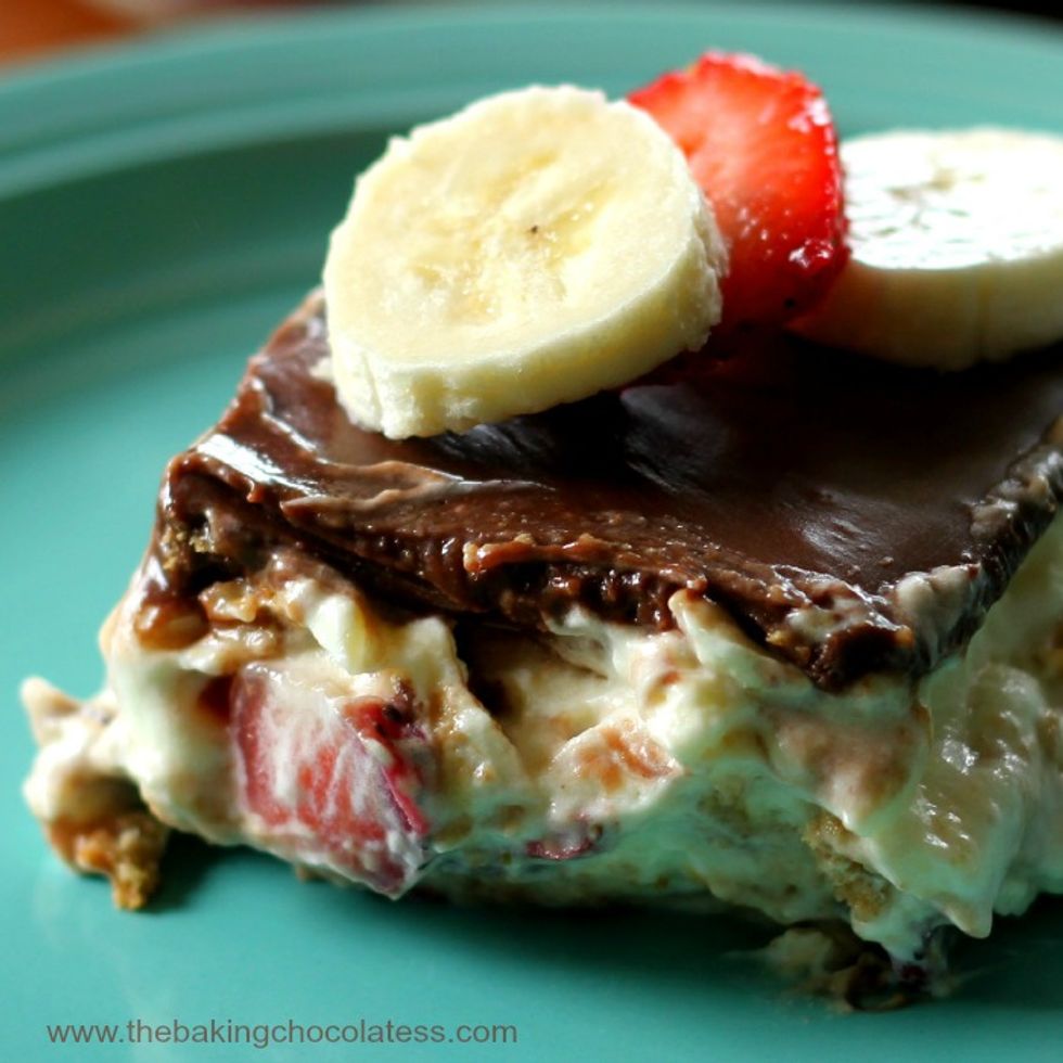 Creamy banana pudding fluff, fresh strawberries, graham crackers and chocolate frosting make this eclair cake perfect for summer party fun!