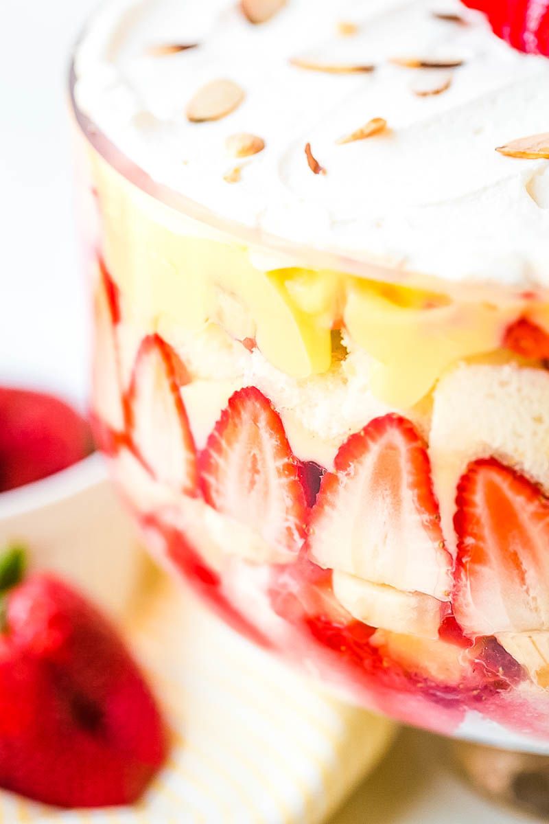 Banana Split Trifle is the perfect dessert for a crowd! This trifle recipe has layers of strawberries, Angel Food Cake, pineapple, bananas and vanilla pudding! This dessert is sure to be the highlight of your party. It's a great dessert option when you entertain in the spring or summer!