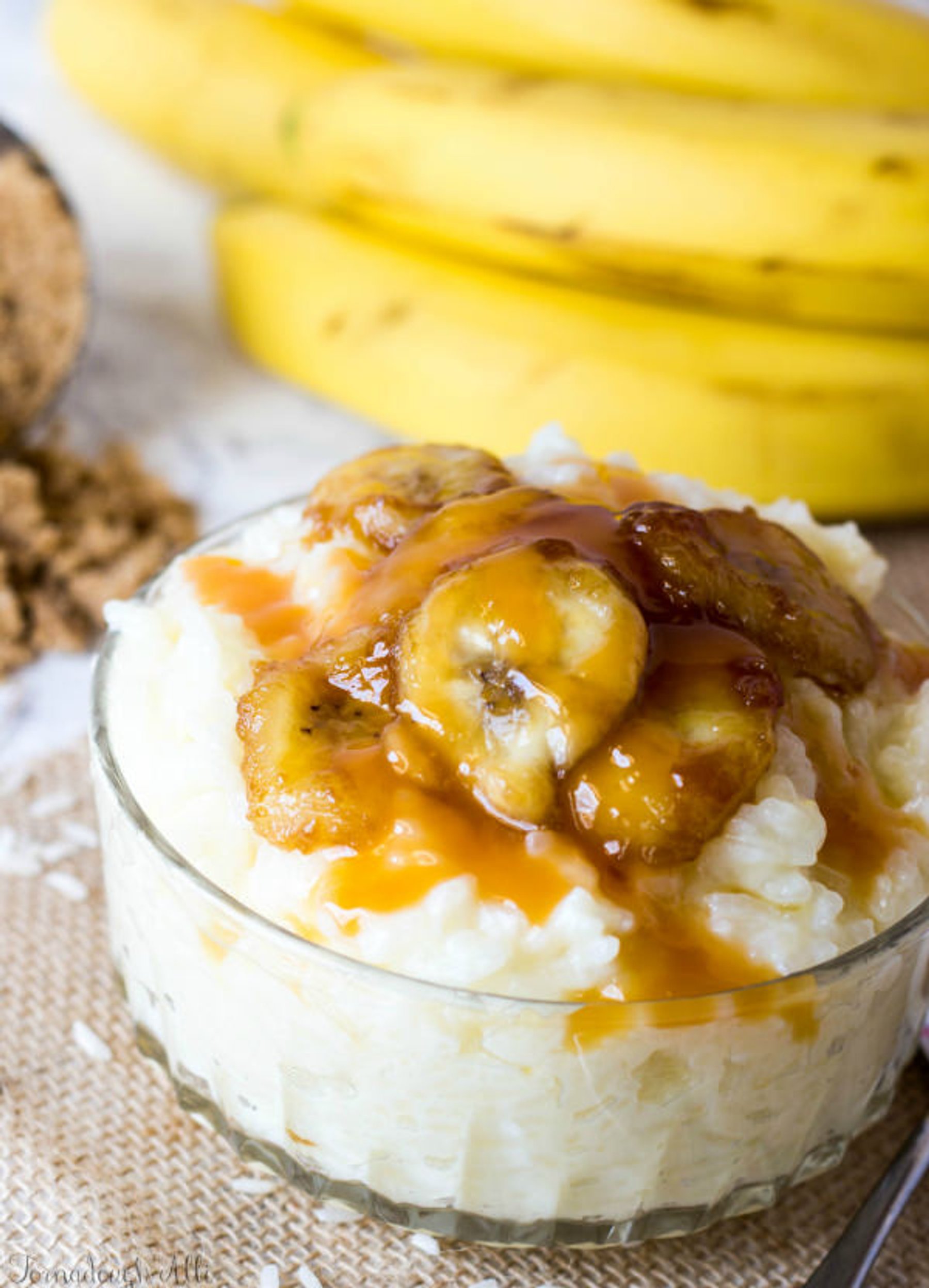 Creamy and delicious rice pudding is topped with a gooey, caramely, bananas foster sauce.