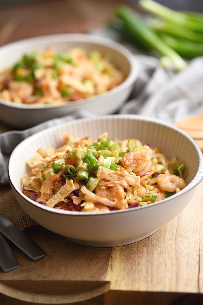 This dish is a mouthful in the best way possible! It's all the things you know and love about bang bang shrimp, combined with the most trendy new healthy, quick dinner food — the egg roll in a bowl. Flavorful, delicious and quick, this bowl is the perfect meal to satisfy your cravings! Get the recipe for Bang Bang Shrimp Egg roll Bowl at MightyMrs.com!