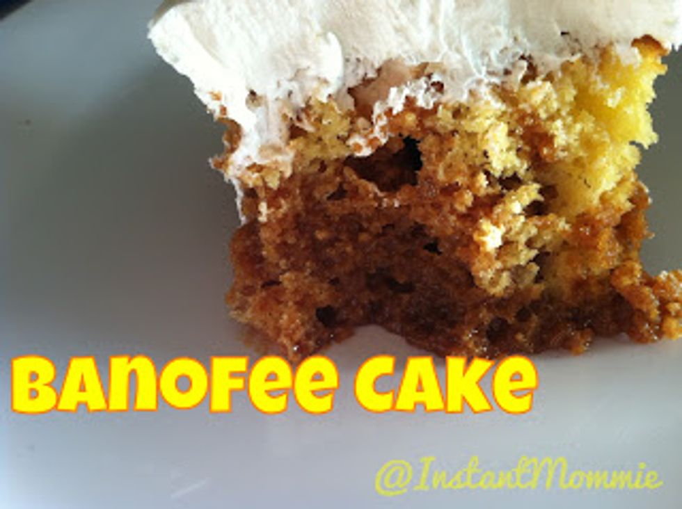 Banoffi is the combination of bananas and toffee. The pie usually consists of a toffe or milky caramel (dulce de leche) (see my homemade method here) bottom layer, with bananas layered on top and finished with cool whip or whipped cream. My cake interpretation comes in the form of a banana cake (yellow cake with banana pudding), dulce de leche sauce and cool whip.