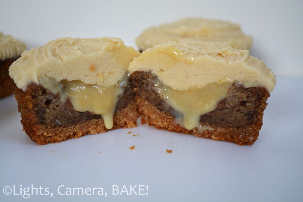 A play on the banoffee pie by using a digestive biscuit base, a moist banana cupcake filled with caramel and topped with a spiced frosting.