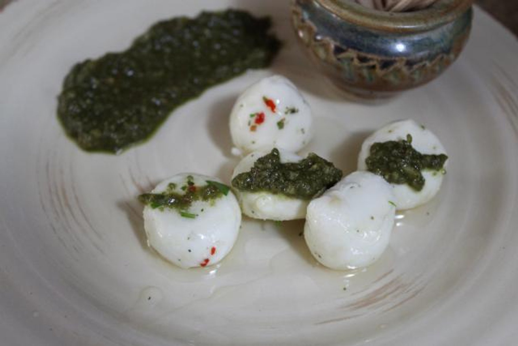 First wash and cut the leaves from your basil. I used my Magic Bullet and packed it in. Then add in your minced garlic, almonds and top off with the olive oil. Blend until you get a smooth, nutty...