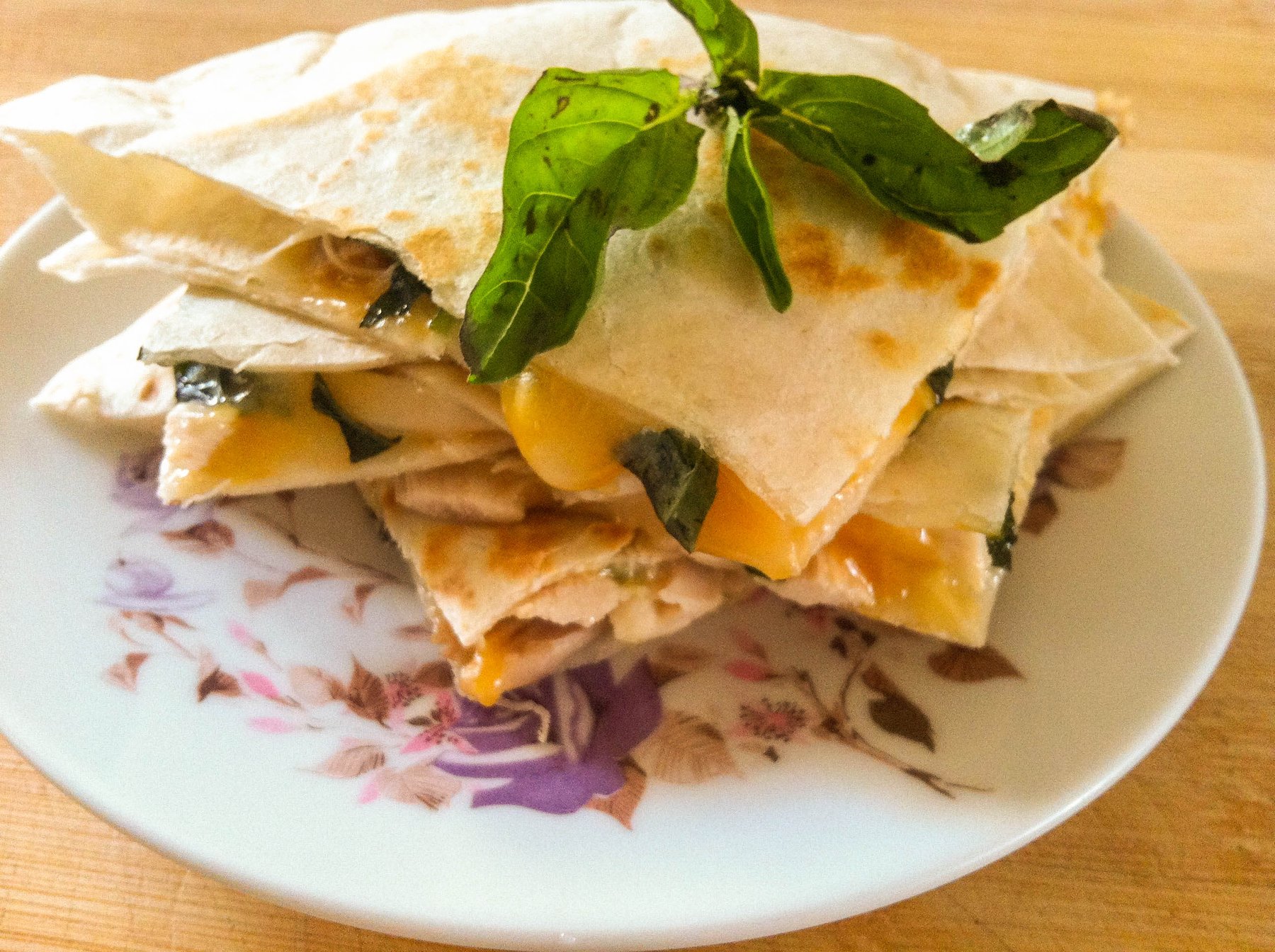 Crispy tortillas filled with melted cheese, refreshing basil, and shredded chicken for a simple yet delicious meal. These quesadillas consist of less than five ingredients but can still tantalize your taste buds.