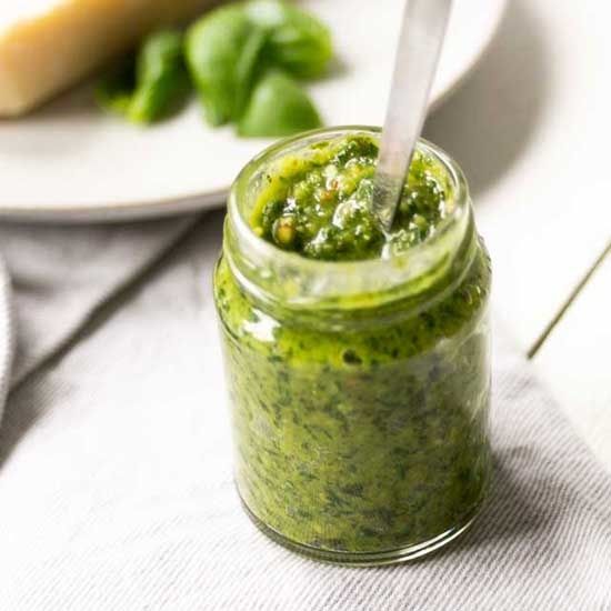 This basil pesto alla genovese is easy to make with classic ingredients like basil, hard cheese, garlic and pine nuts. You can eat it for example with pasta, bread or chicken.