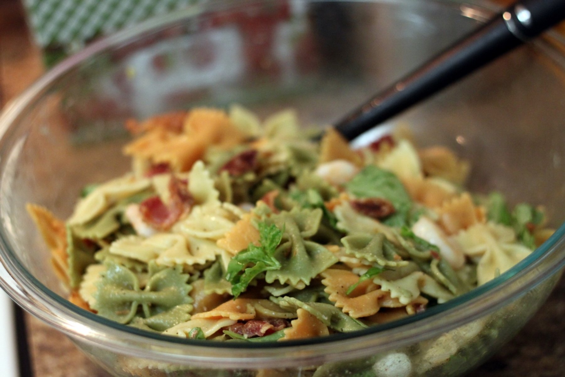 Cook pasta, drain & place in large bowl. While cooking, sautee shrimp & chopped garlic in a splash of olive oil. When cooked, add to the pasta & mix well. Cook bacon & crumble pieces into pasta. Add lemon...
