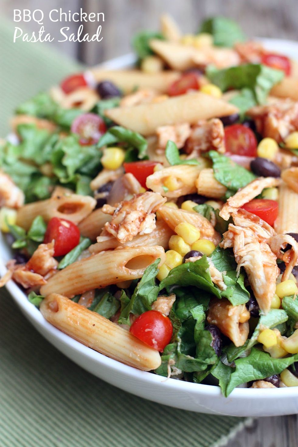 Penne pasta, chicken and cheese smothered in a creamy BBQ sauce mixture and tossed with corn, black beans and lettuce!