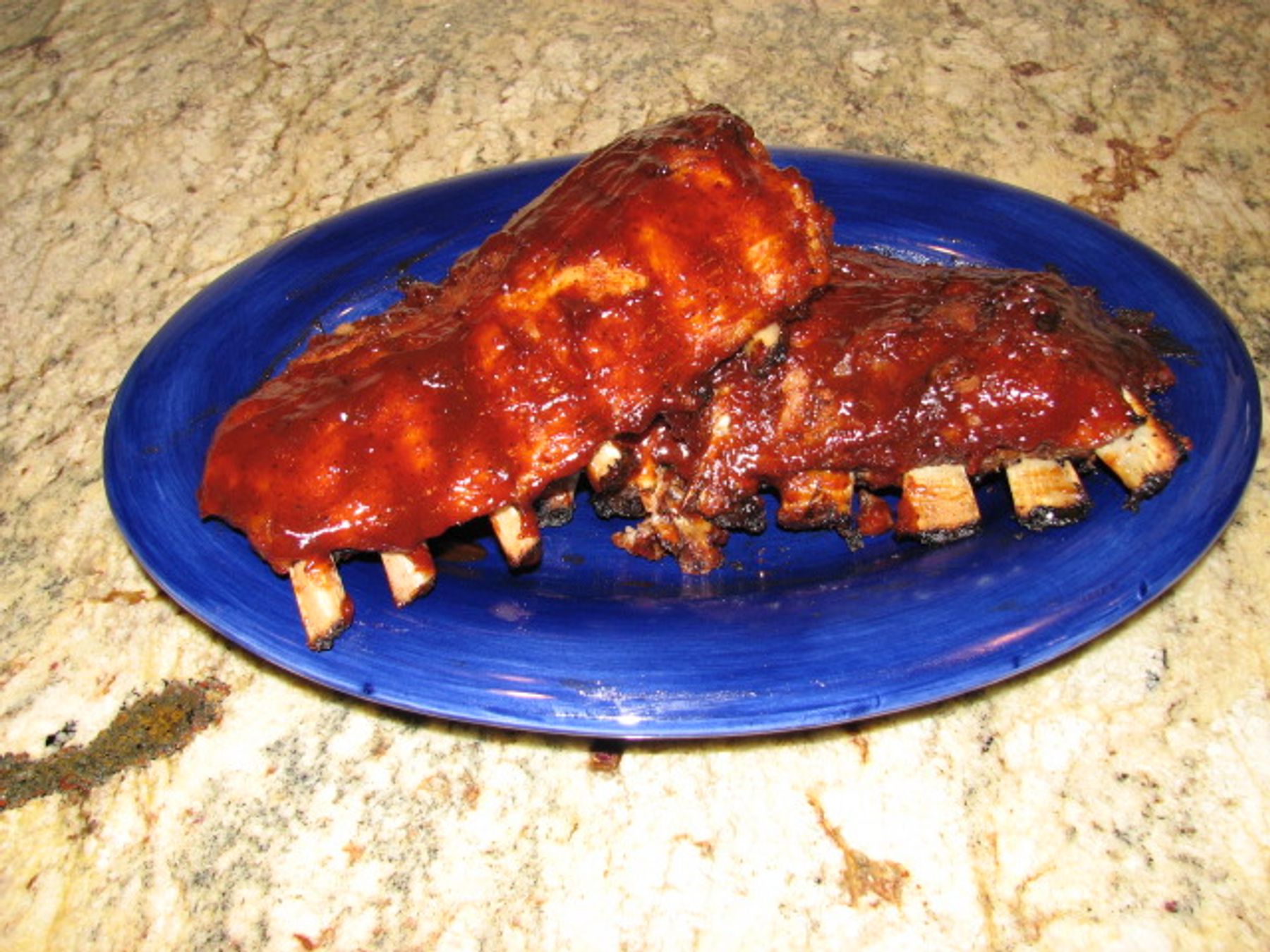 Remove ribs from roasting pan. Baste with your favorite bbq sauce (we like Sweet Baby Ray's) and grill over medium heat just until sauce is thickened and slightly grilled.
