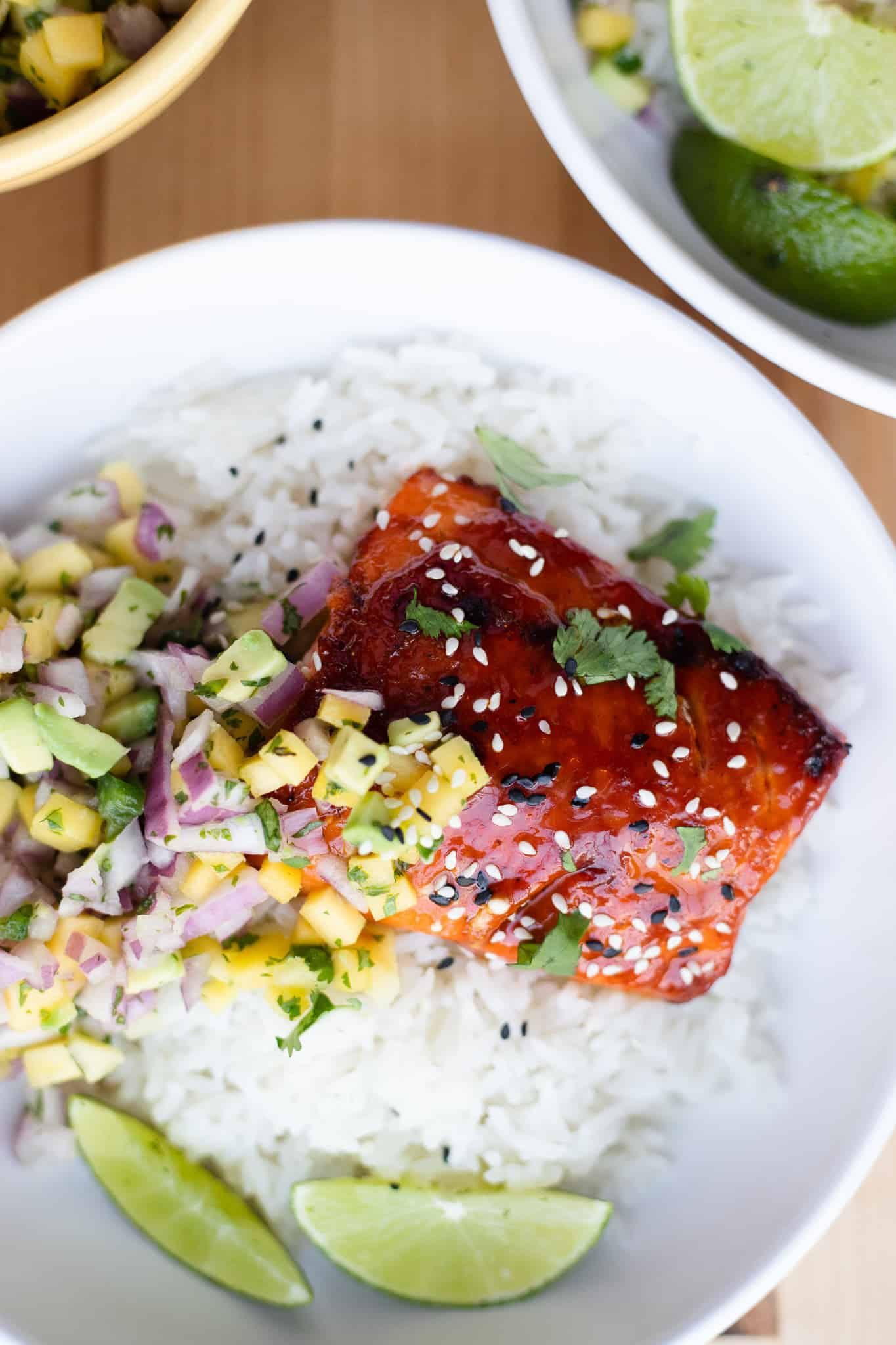 BBQ Salmon Bowls with Mango Avocado Salsa