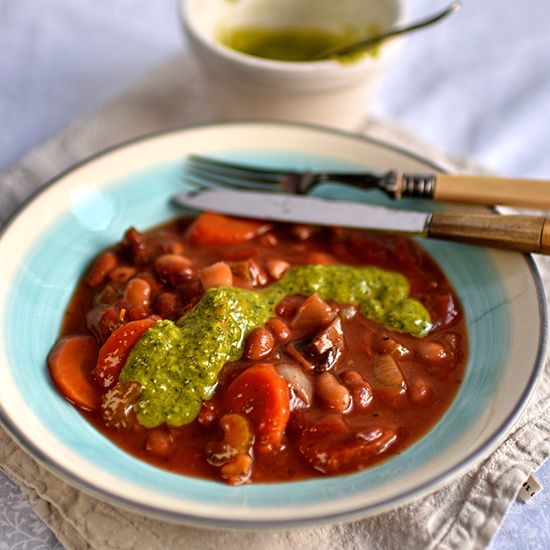 I came up with this vegan casserole very recently, on an evening when a friend called round unexpectedly and stayed for dinner. It was hearty, full of flavour and delicious. I served it with mashed potatoes and a generous spoonful of pistou.