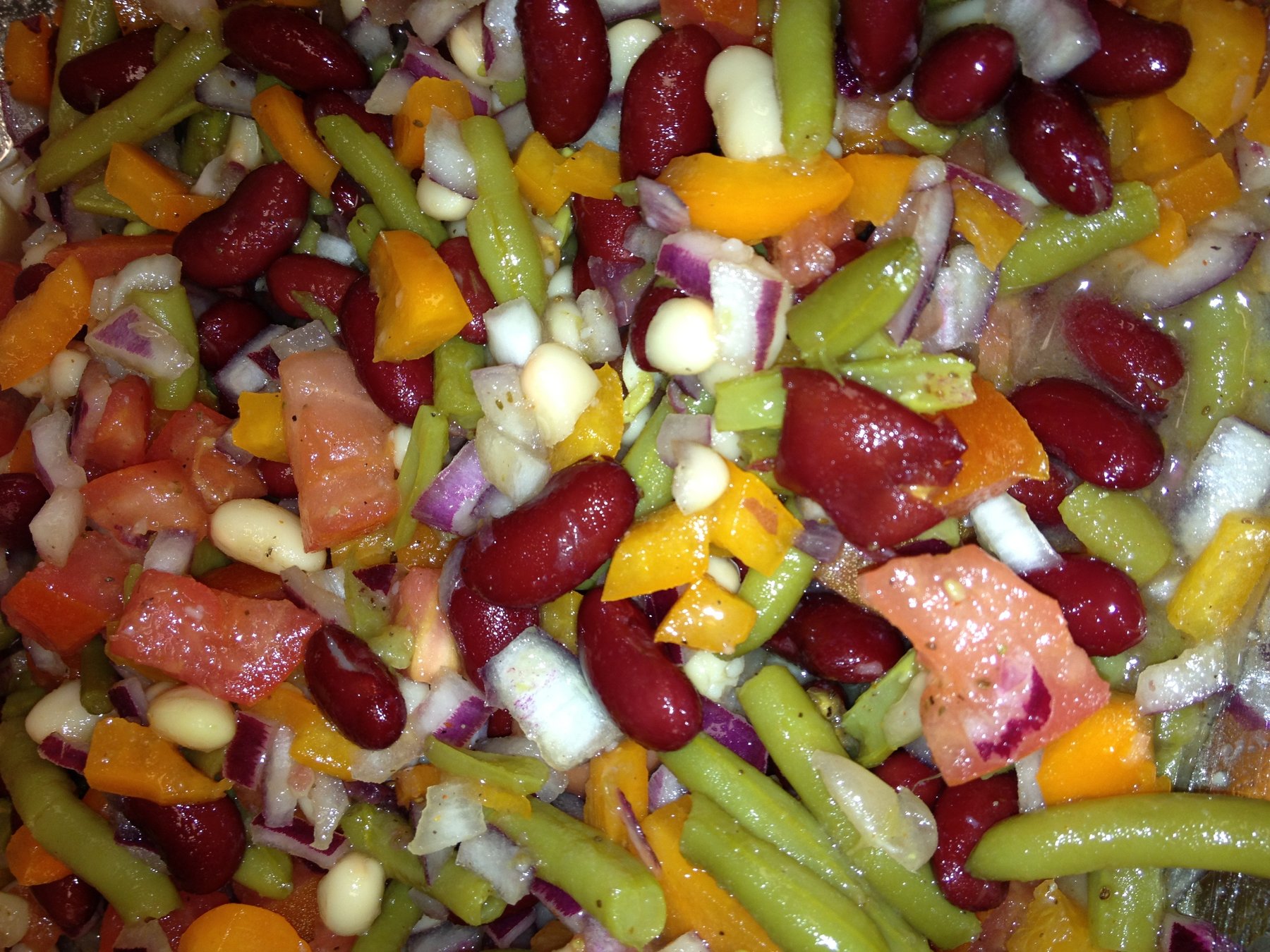 This a remake on a three bean salad with orange bell pepper and tomatoes. The fresh veggies give this salad a lighter taste and vibrant colors.