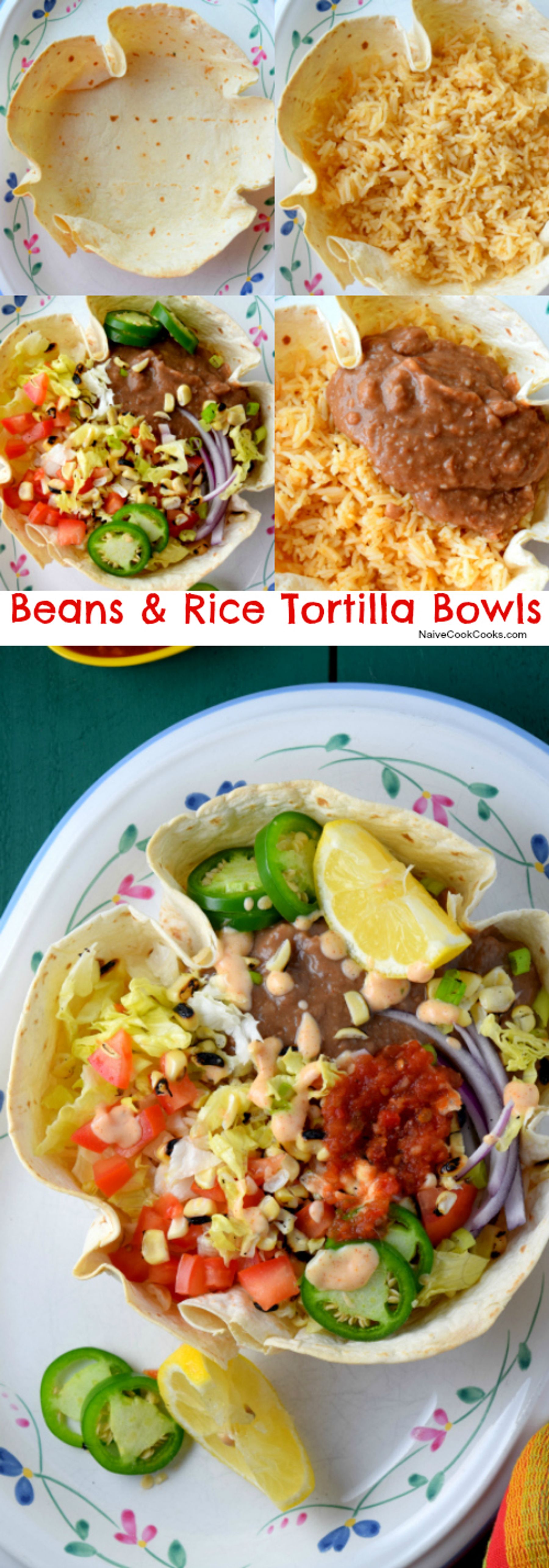These Tortilla Bowls are filled with fresh homemade refried beans, taco seasoned rice, chipotle salsa, spicy ranch & fresh veggies! Perfect healthy and delicious meal ready in under an hour!