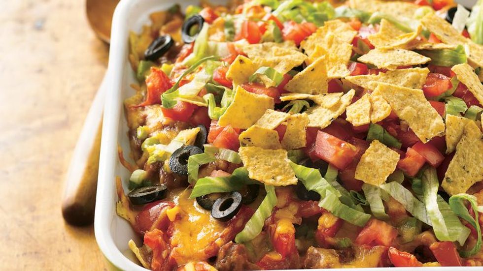 Tasty taco ingredients combine in this easy casserole topped with crunchy tortilla chips.