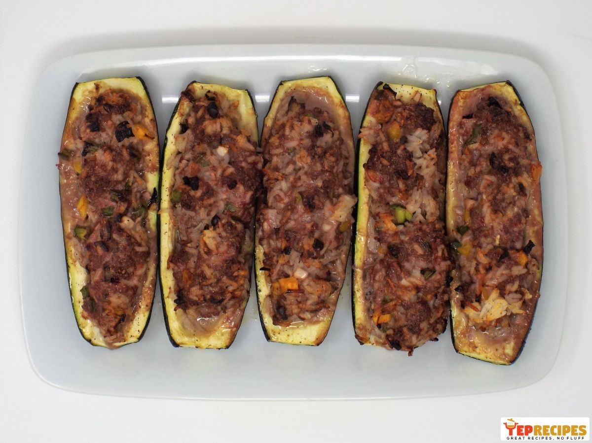 Ground beef, rice, peppers, and Parmesan cheese stuffed inside zucchini and baked.