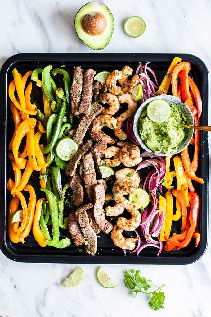 This easy sheet pan method for Beef and Shrimp Fajitas makes getting a delicious dinner on the table so fast! A simple fajita spice mix is tossed with onions, peppers, steak and shrimp, and everything cooks together in 10 minutes!