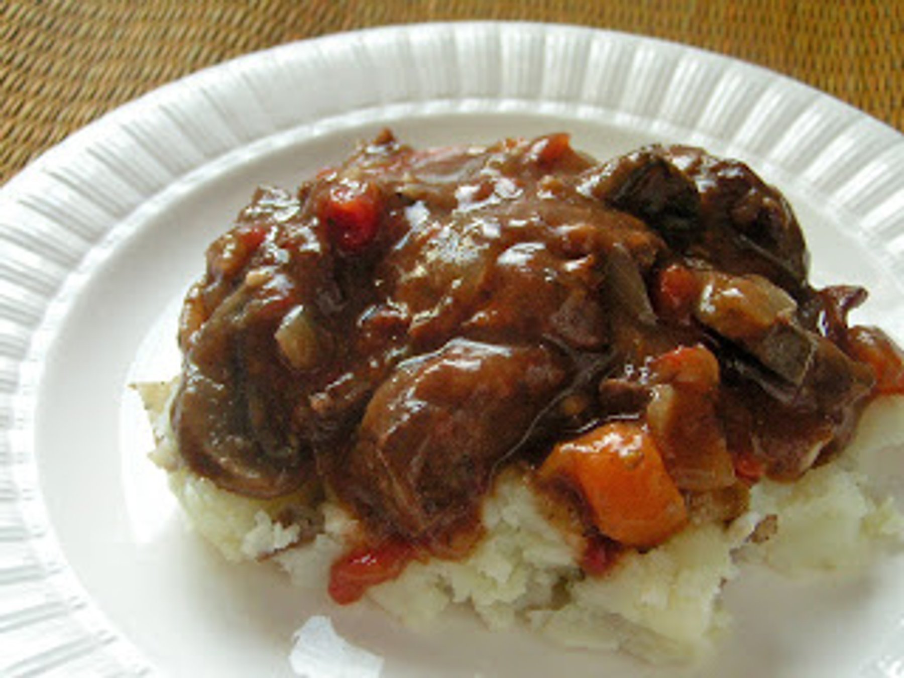 The main inspiration and directions for this recipe came from SimplyRecipes.com. I served it over smashed potatoes {think unpeeled, fast mashed potatoes} but you can easily serve this alone, with a side of Lion House Rolls or French Bread to sop up the leftover juices. Yum.