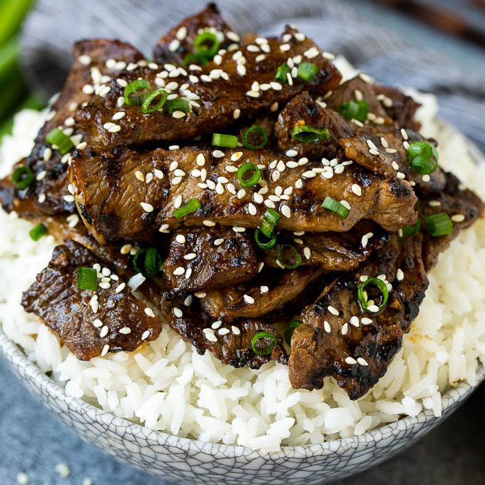 This beef bulgogi is steak in a sweet and savory marinade that's grilled or pan seared to perfection. A traditional Korean dish that's perfect served over steamed rice or inside lettuce leaves.