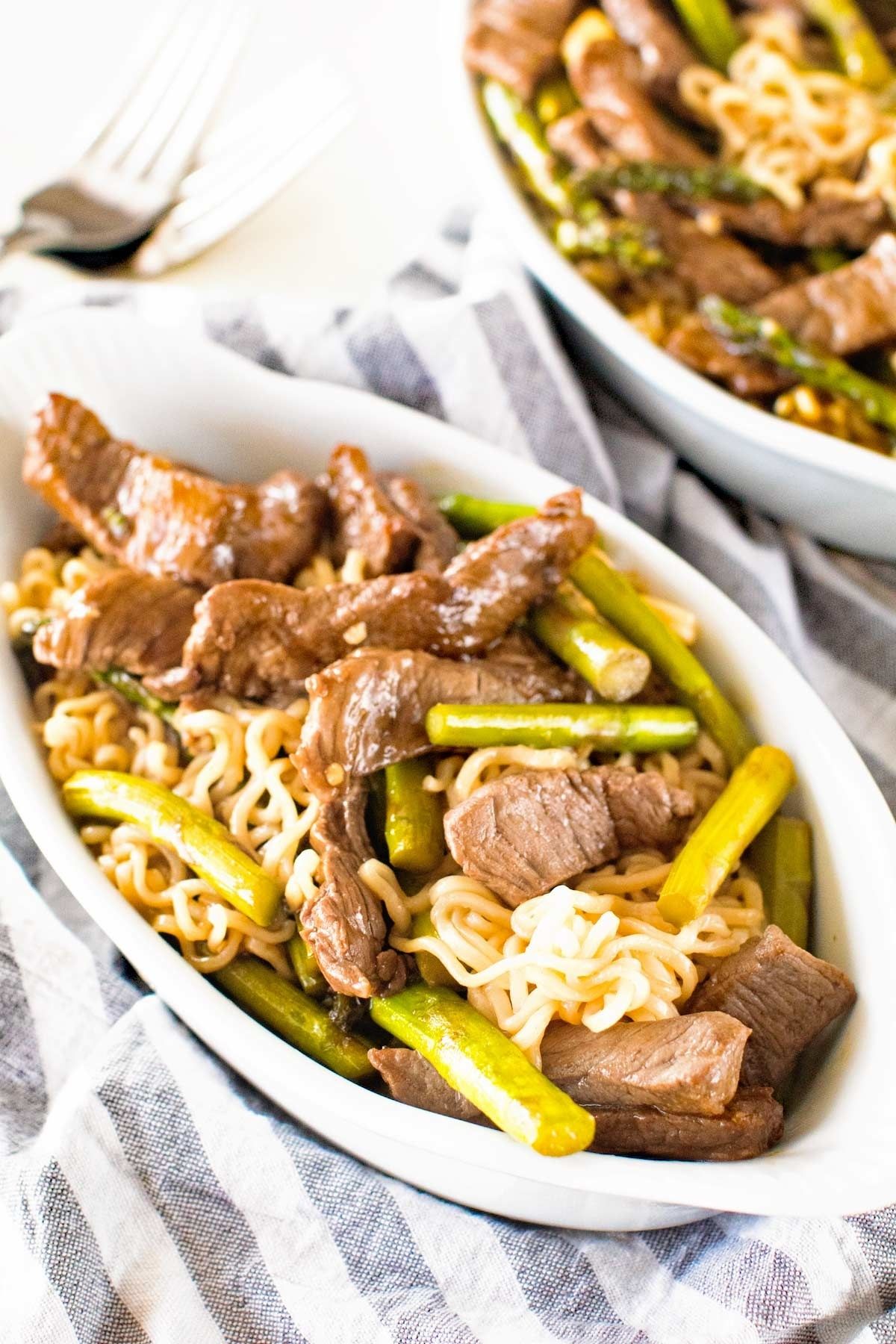 Beef Lo Mein with Asparagus is a quick stir fry dish with thinly sliced steak, Ramen noodles and asparagus. Ramen Lo Mein is the perfect weeknight meal that is fancy enough to serve to company! Plus, it's ready in 20 minutes!