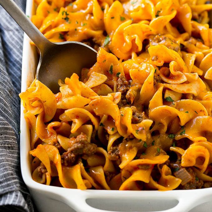 This beef noodle casserole is ground beef in a rich tomato sauce, tossed with egg noodles then topped with plenty of cheese and baked to perfection. An easy comfort food dinner that's perfect for feeding a crowd.