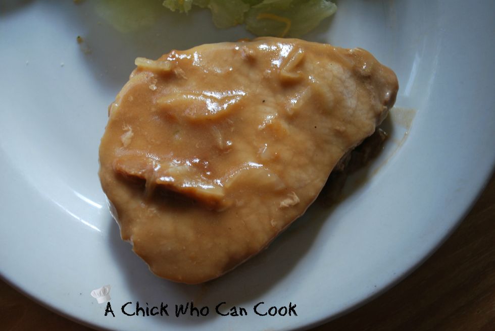 Add the soup mix,water,butter and flour to a pan stir until butter is melted. Add the pork chops and cover flipping every 10 mins on Med heat until cooked fully.