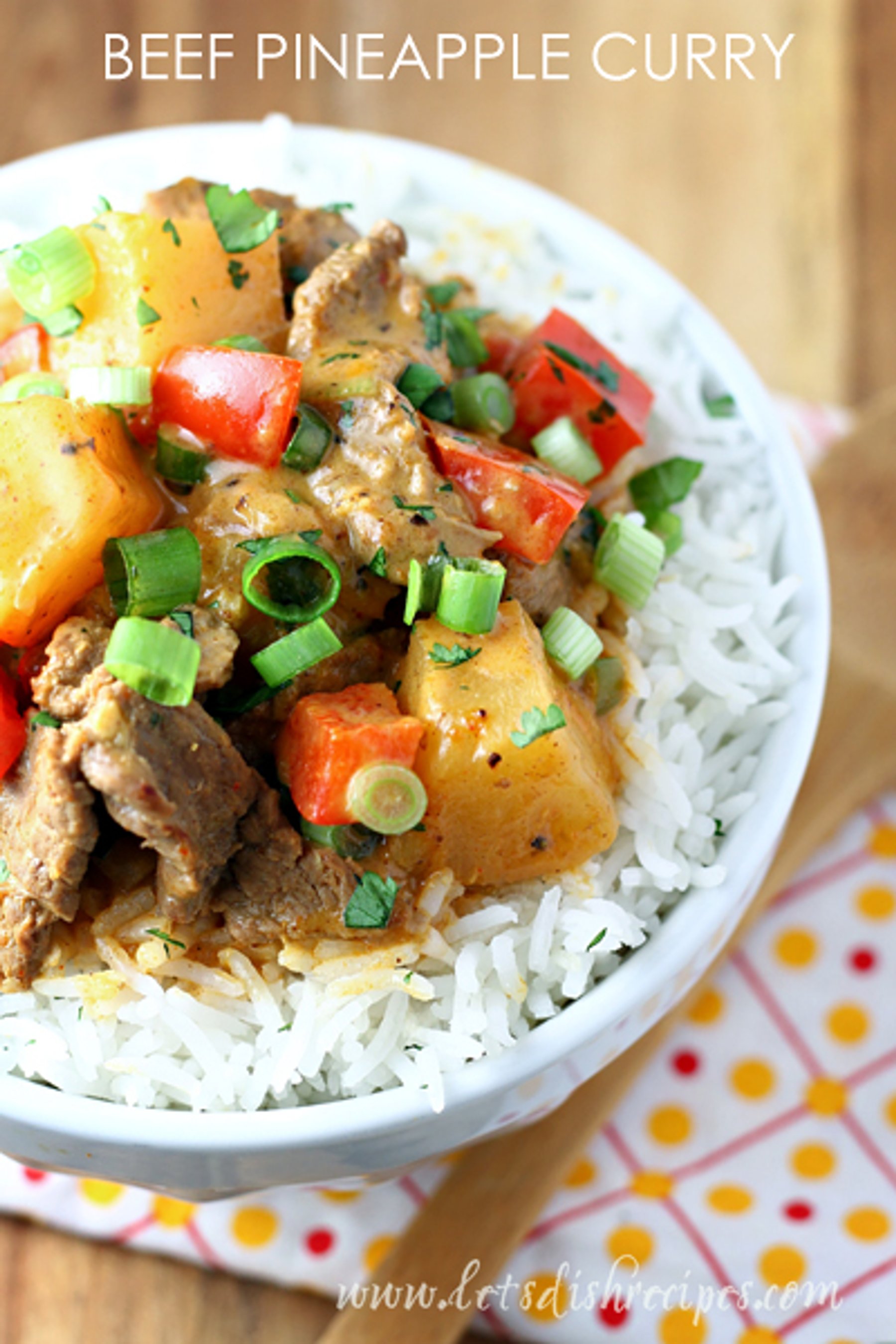 Thinly sliced beef with pineapple chunks and red peppers in a creamy, coconut milk based curry.