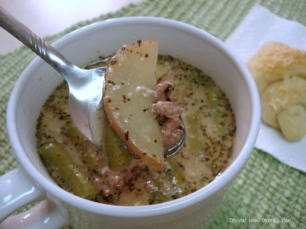 Ground beef, chunks of potatoes & green beans make this soup hearty & delicious! Plus it's made in a crock pot! Can't get better than that!