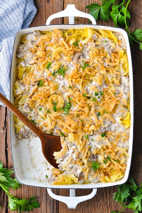 All of the flavors that you love from the traditional meal come together in this cozy and hearty Beef Stroganoff Casserole! A cream of mushroom and sour cream sauce made with ground beef and mushrooms is layered with buttered egg noodles and topped with crispy fried onions. Bake everything in one dish for an easy, satisfying dinner that the whole family can agree on!