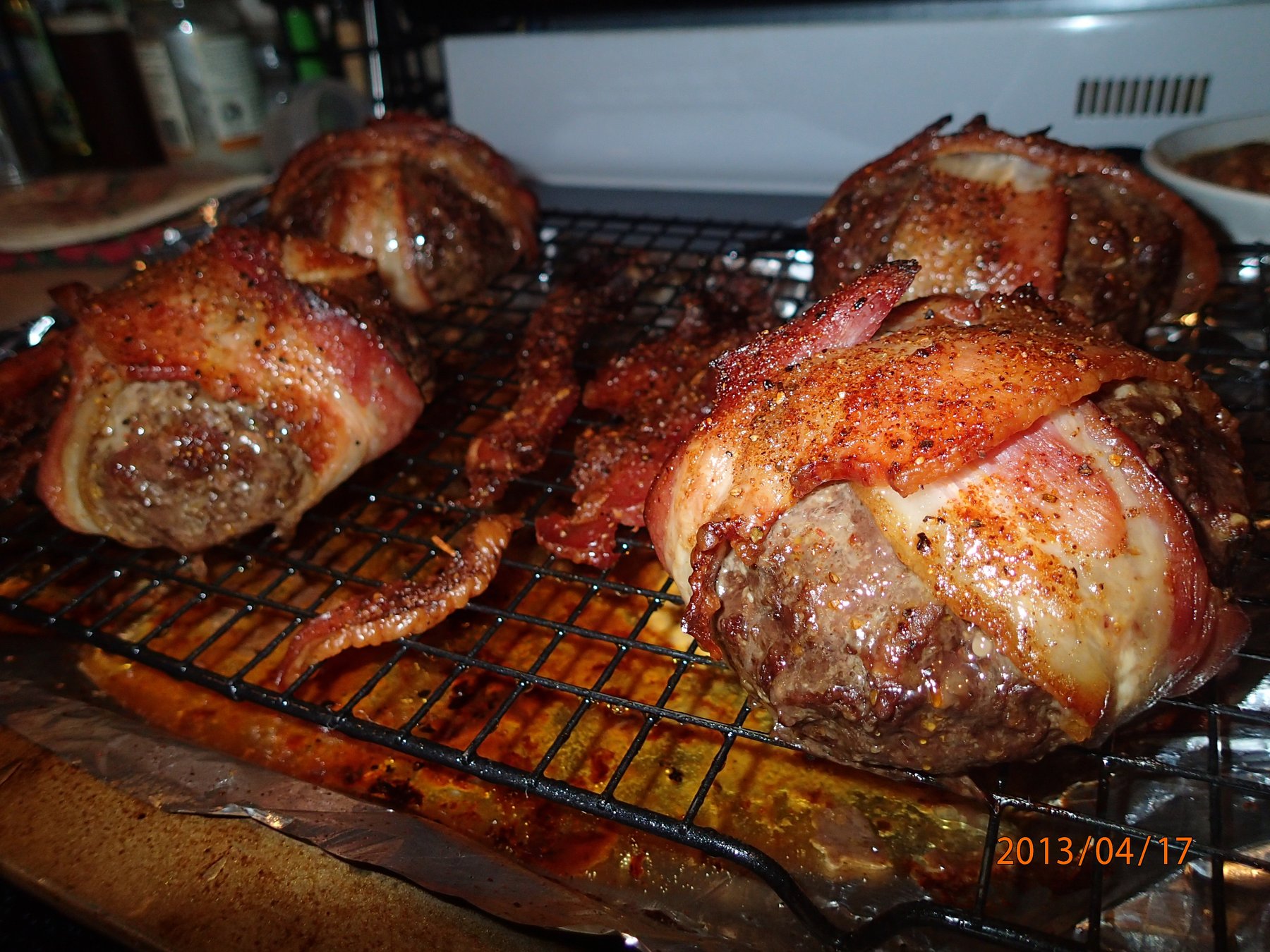 Cheeseburgers outside in! The cheese is encapsulated in the meat so when you bite into it the cheese stays melted and gooey. I use a very lean beef so to keep them moist I wrap two strips of bacon around them and then bake them in the oven on a rack.