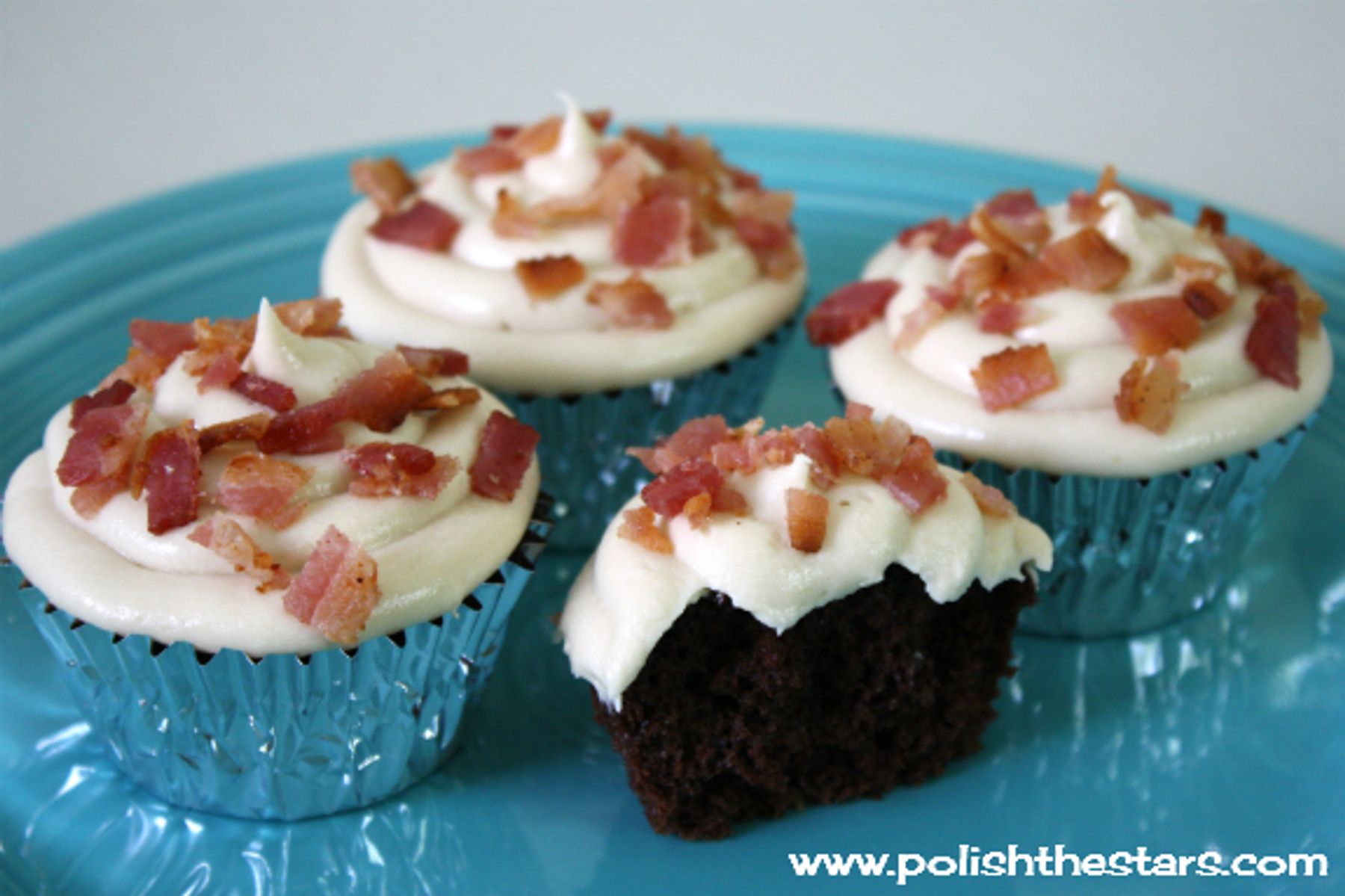 Inspired by the "Spring Break Cupcakes" on 2 Broke Girls, these rich cupcakes feature a chocolaty beer batter cupcake topped with maple buttercream frosting and bits of real bacon.
