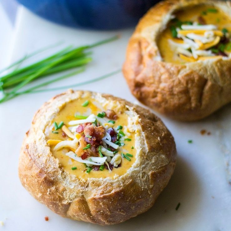 Beer Cheese Soup is creamy, cheesy and the perfect comfort food to warm you up on a cold day. Serve up this easy Beer Cheese Soup recipe in a bread bowl and garnish with some bacon and chives for the perfect meal.