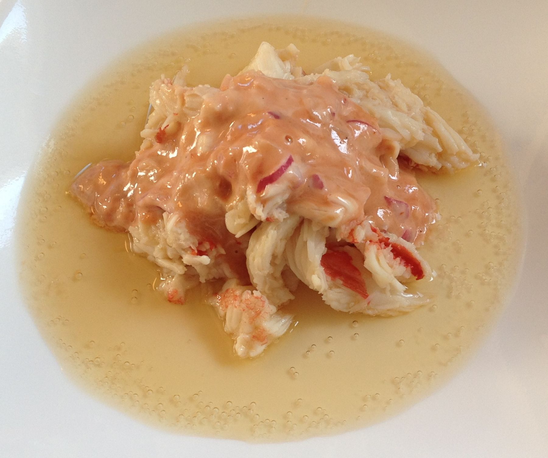 Mix mayonnaise, ketchup, lemon juice and chopped onion, put some on the crab meat. Serve the remaining sauce on the side.