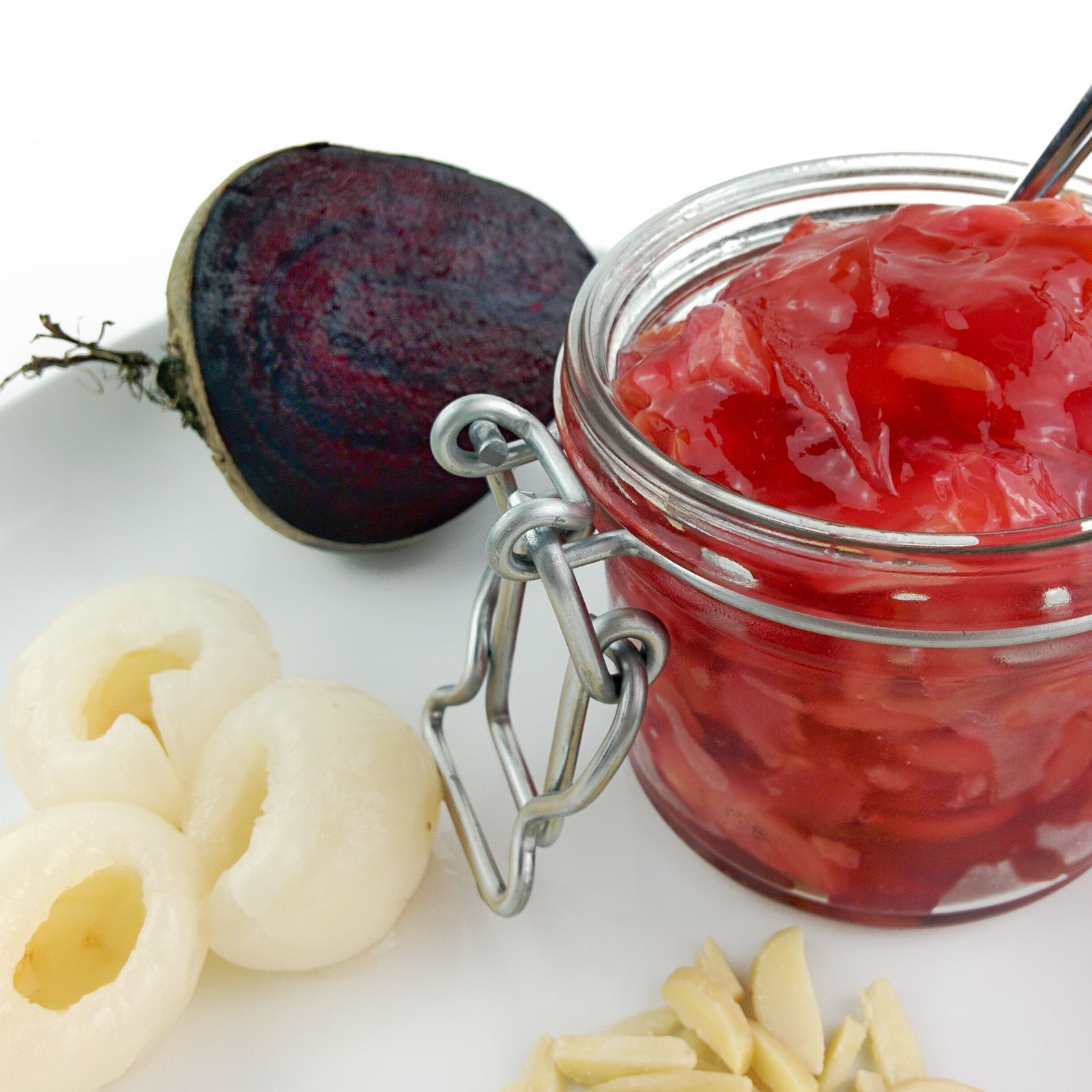 Beet root, lychee and almonds get married together in a colorful, mild and delicious jam!