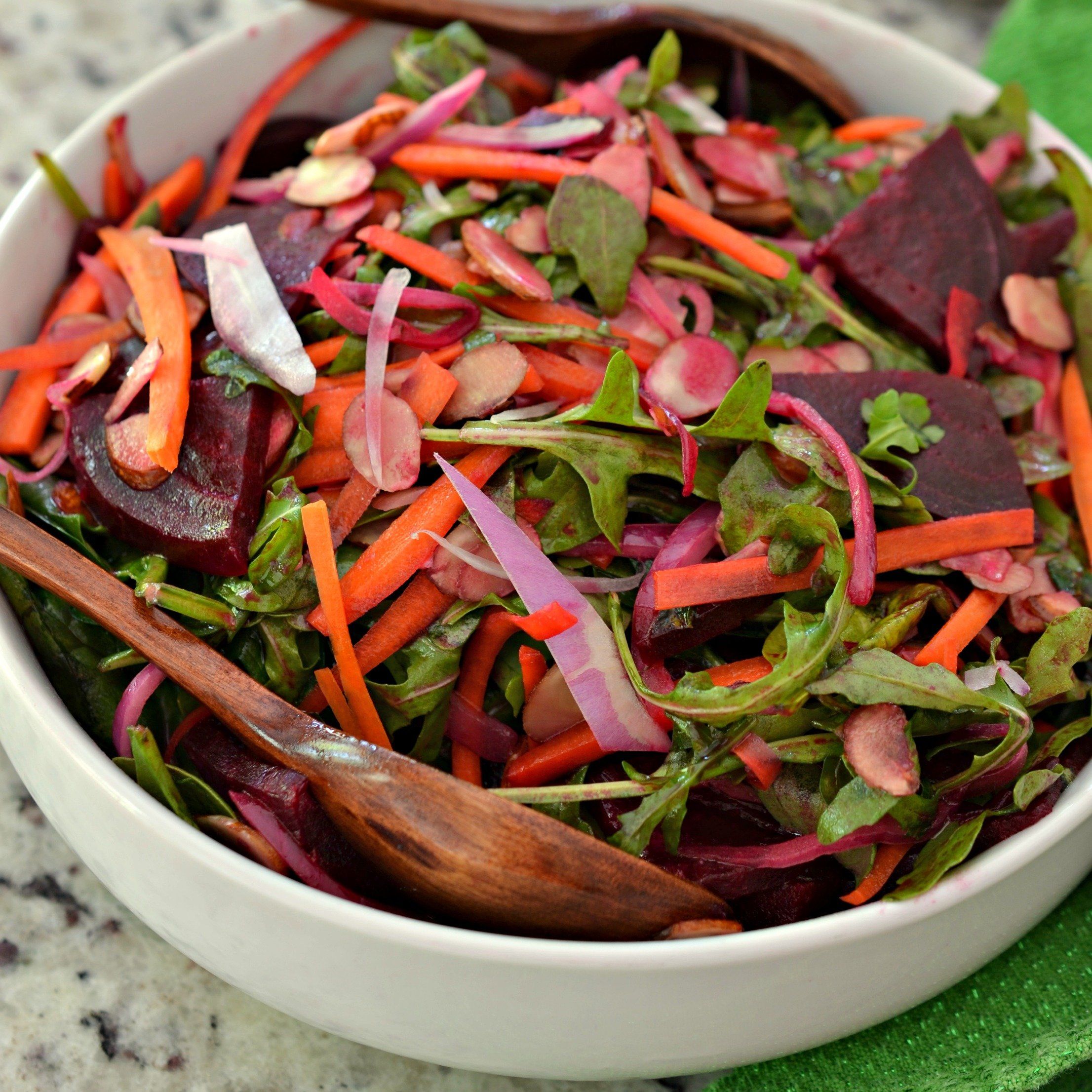 This delectable Beet Salad is flavor packed with sweet beets, peppery arugula, carrots, red onions and almonds all drizzled with a light honey mustard vinaigrette.