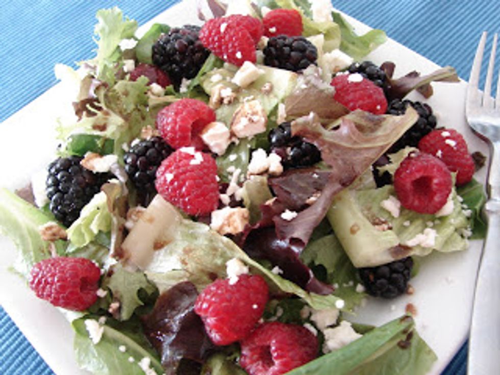 Combine all dressing ingredients and mix well with a whisk; set aside.  Combine lettuces and toss to combine.  Just before serving add berries, feta cheese crumbles and sugared pecans; toss lightly.  Serve...