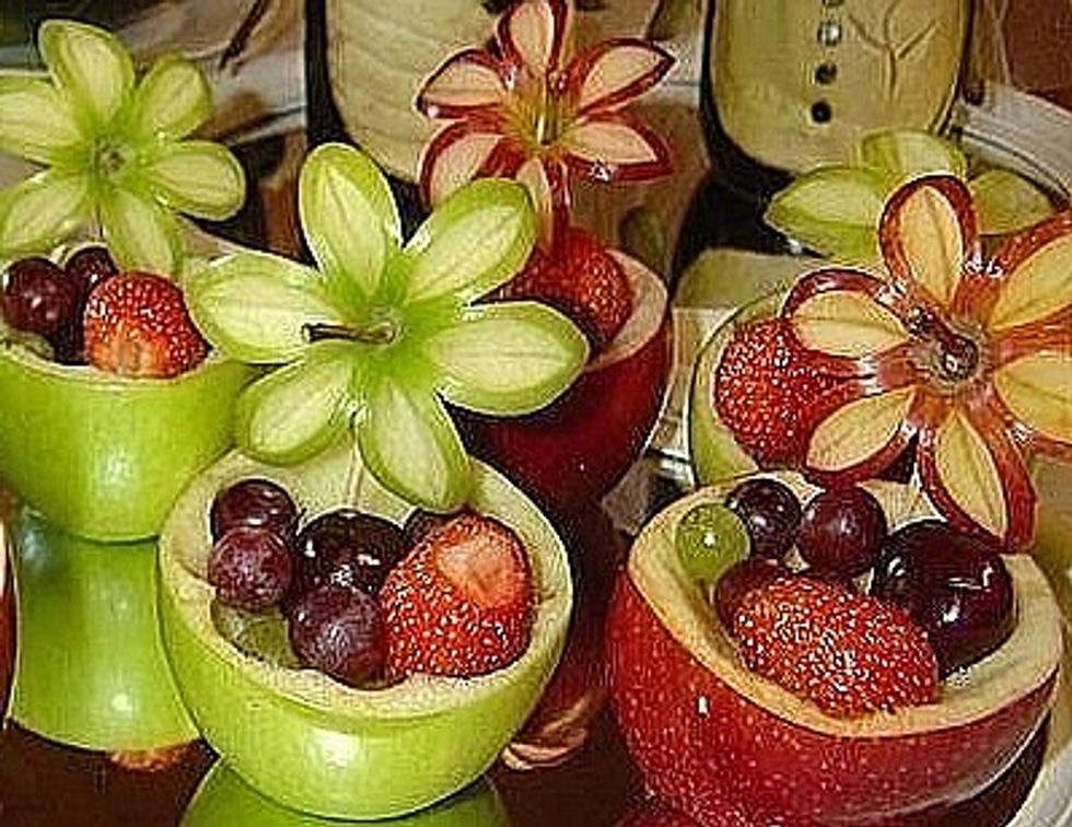 Apple with the stem. This piece of Apple cut flower. Remove the middle of the Apple a little spoon of ice cream. Dip apples an lemon juice.