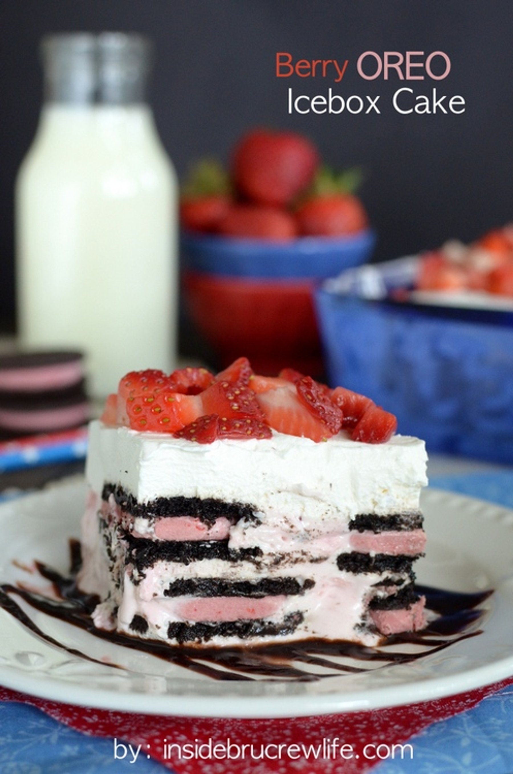 Layers of Berry Oreo cookies and a no bake berry cheesecake makes a delicious summer dessert.