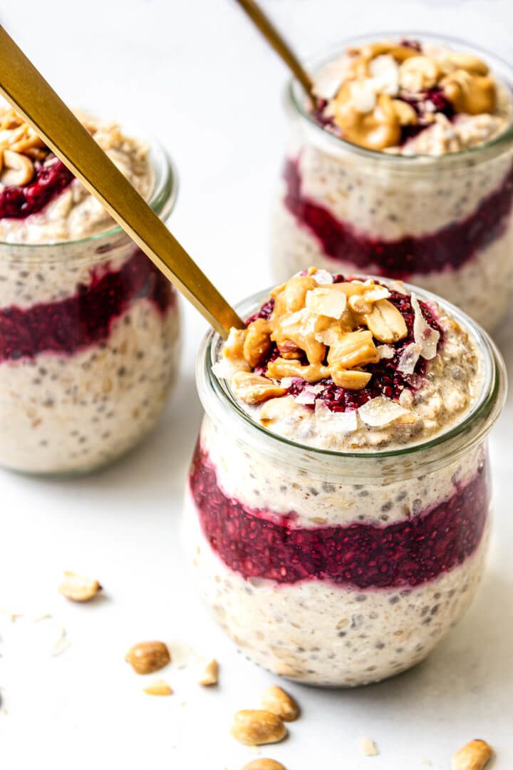 SIMPLE, HEALTHY, TASTY! These thick and creamy Berry Overnight Oats are like a cozy tastebud hug with their combination of cinnamon, peanut butter, golden flax, chia seeds and a not too overly sweet ribbon of berry chia jam in the middle (and maybe a dollop on top too 😉) Just 8 ingredients, 5 minutes prep, and SO delicious! Naturally sweetened, gluten-free, and a perfect breakfast to start the day.