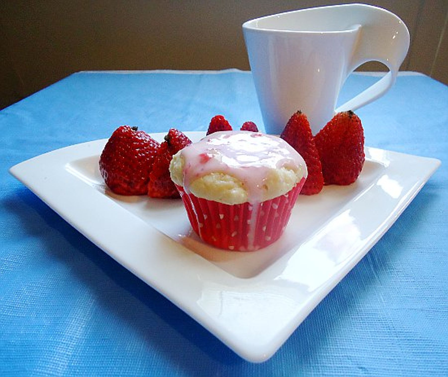 Berry Rhubarb Jam-Filled Muffins with Strawberry Glaze