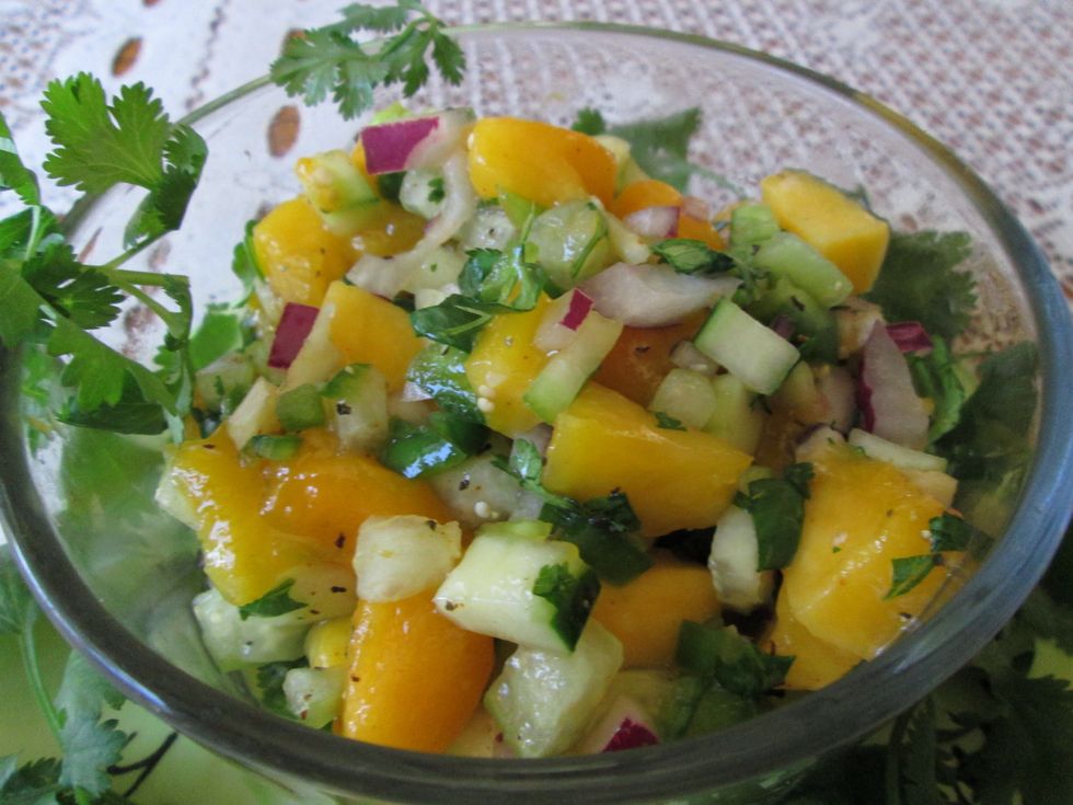 You won't believe the combination of flavors you get from this Fresh Mango Salsa recipe. The tomatillo's and cucumbers make it taste so refreshing. Add it to a green salad, add it to an omelet with gouda cheese or use put on any kind of grilled fish. Yum!!!!