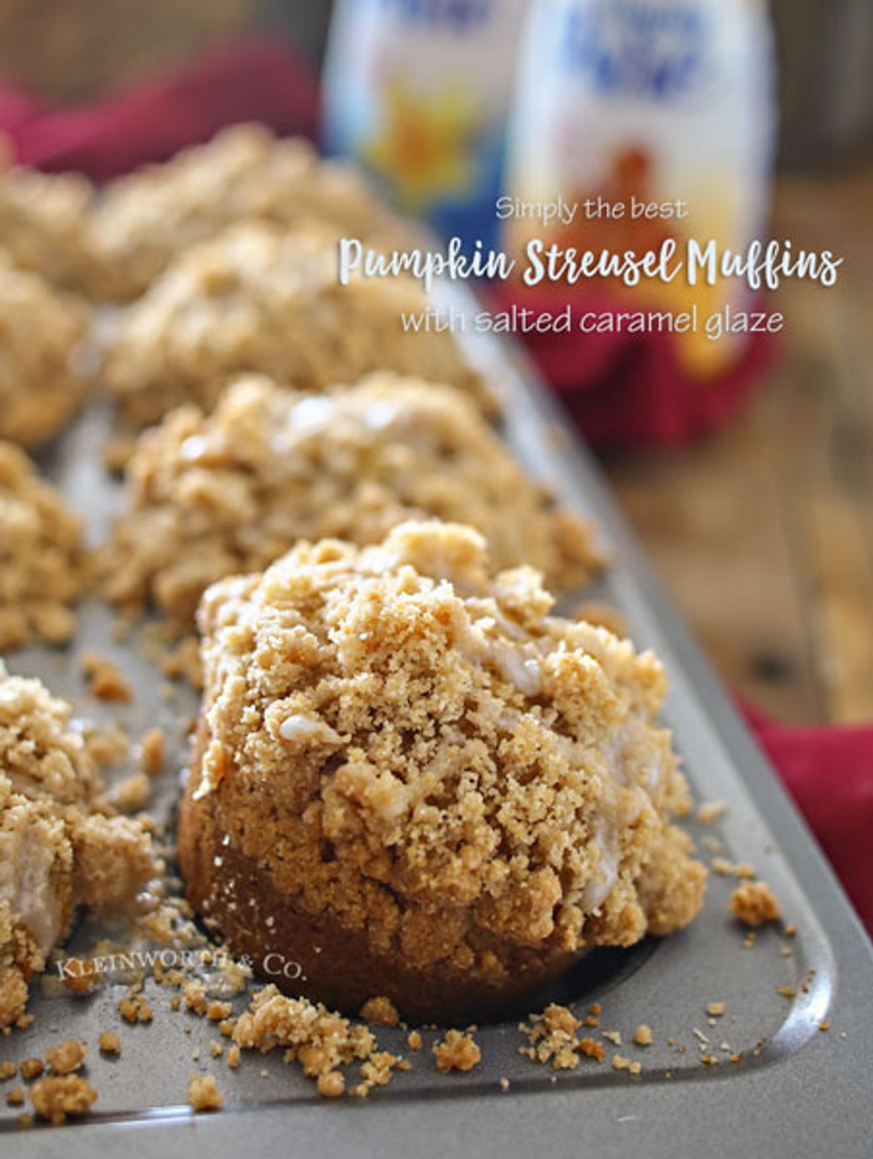 Pumpkin Streusel Muffins topped with salted caramel glaze