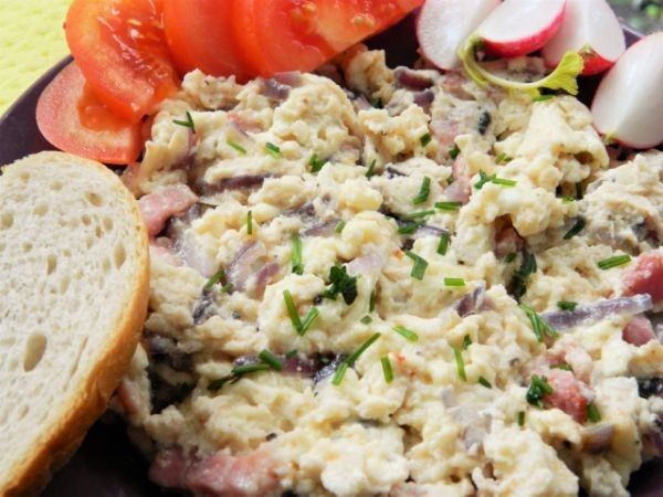 Today, Sunday morning, I thought I'd show you the best scrambled eggs recipe. It contains onion, bacon and cheese and is served with fresh bread, tomatoes and radish.