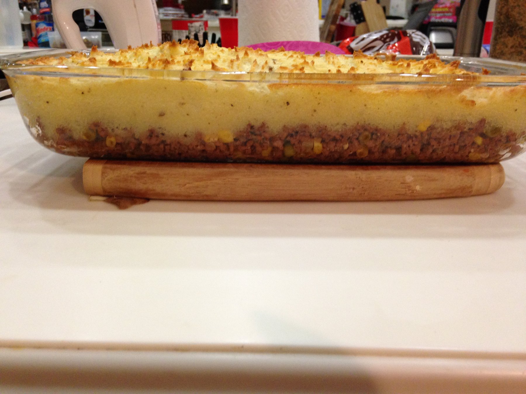 Place beef mixture in the bottom of a glass cookware and then spread the mash potatoes evenly on top. Use a fork to make criss cross designs in the mash potatoes.