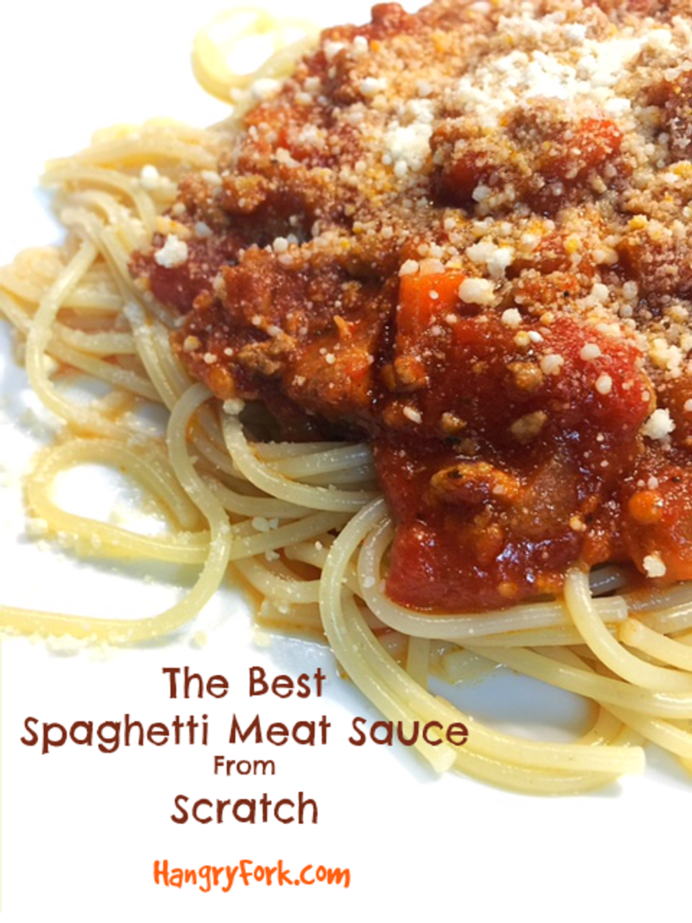 The best spaghetti meat sauce recipe from scratch. This recipe does NOT have that typical metallic taste you get with other homemade spaghetti sauces thanks to the secret ingredient.