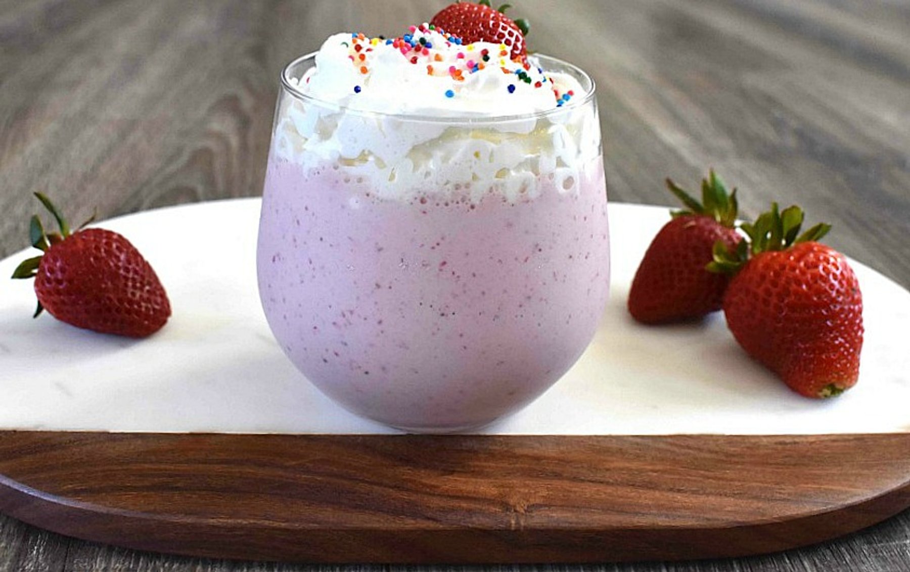 Sit back and enjoy this better than classic with sugar sprinkled strawberries. Garnish with your favorite whipped cream and sprinkles and wait that that gleeful smile to take over your face.
